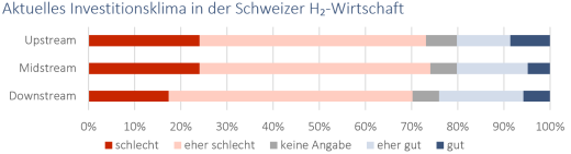 Im Vergleich zum Vorjahr hat sich die Einschätzung zum Investitionsklima in der Schweizer Wasserstoffwirtschaft auf allen Wertschöpfungsstufen verschlechtert: Drei von vier befragten Personen bewerten es negativ. Erklärungsansätze liegen in den durchwegs als weniger gut eingeschätzten staatlichen Rahmenbedingungen, aber auch in den weiterhin hohen Strompreisen.